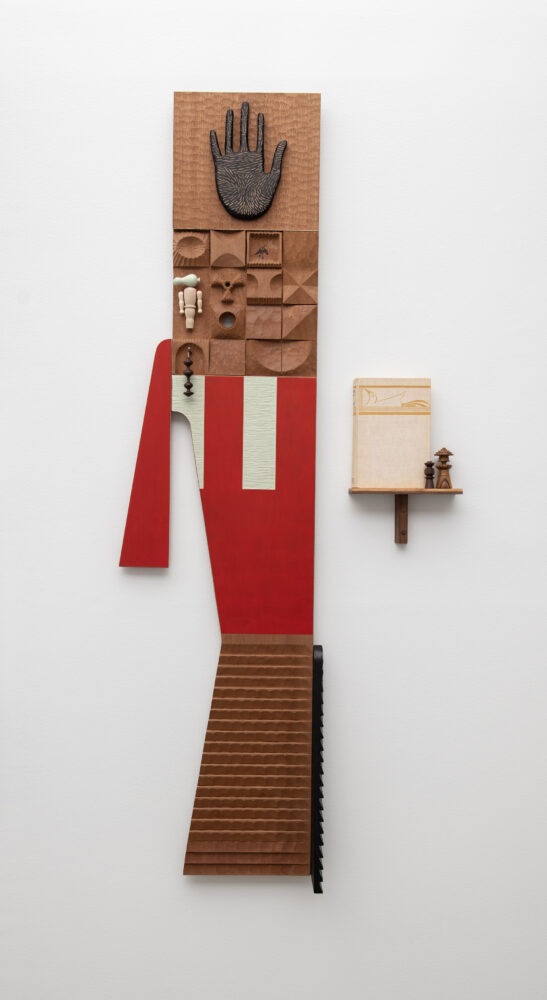 Atomic Kachina Atomic Kachina Title: Atomic Kachina Artist: Edgar Orlaineta Date: WARP Wood 2025 Materials: Wood, acrylic paint, book, thread, black ink Dimensions: 70 3/4H" x 18 1/2W" x 4 3/4D" Read More