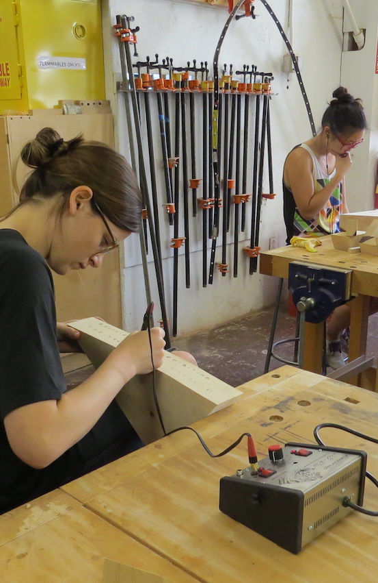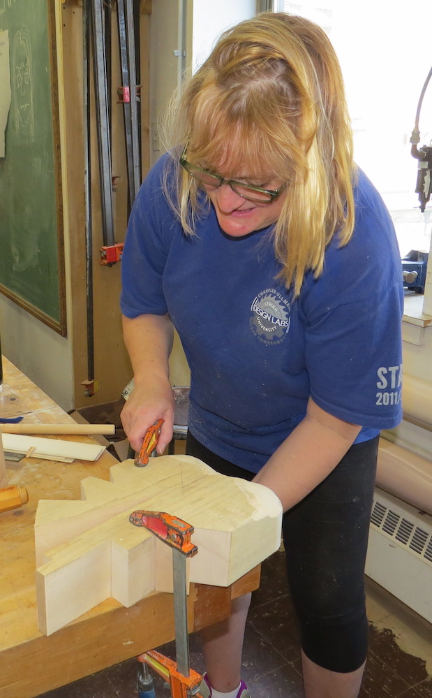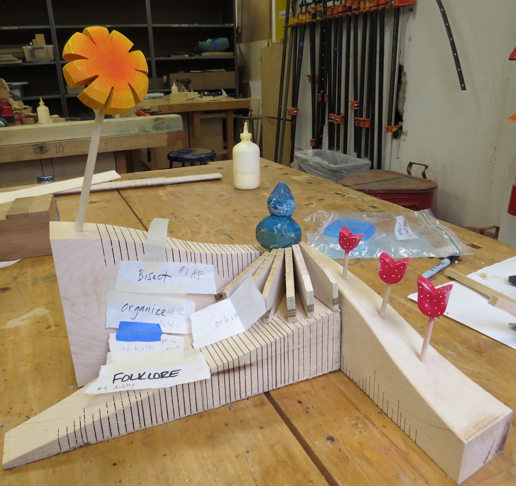 Seven wood artists, seven blocks of basswood, dozens of words, a shop full of machines, tools, and supplies, a deadline for the Windgate ITE Residents to finish a collaborative project for the upcoming Furniture Society Conference at UArts …. combine those ingredients to make shavings, paint, and texture!