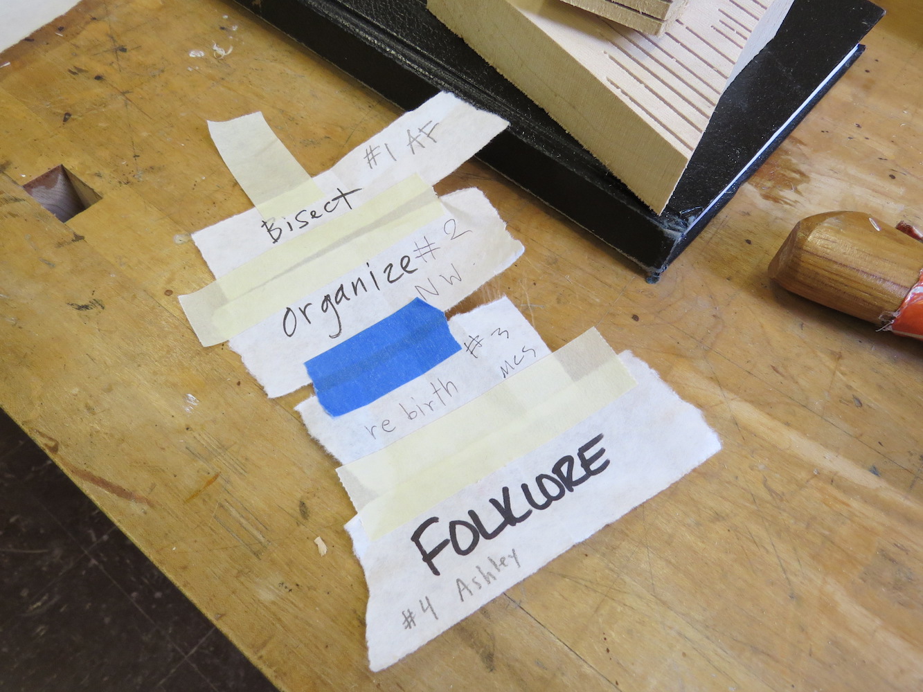 Here’s the process: 1) Each artist wrote ten words on individual slips of paper and put them into a box. 2) We cut up a large slab of basswood into seven pieces. 3) Each artist randomly selected a word to use as inspiration and began working on her chunk of wood. Number 1 was written onto the paper, along with the artists’ initials. 4) Each artist will eventually work on all the pieces, each time using a new word, selected at random.