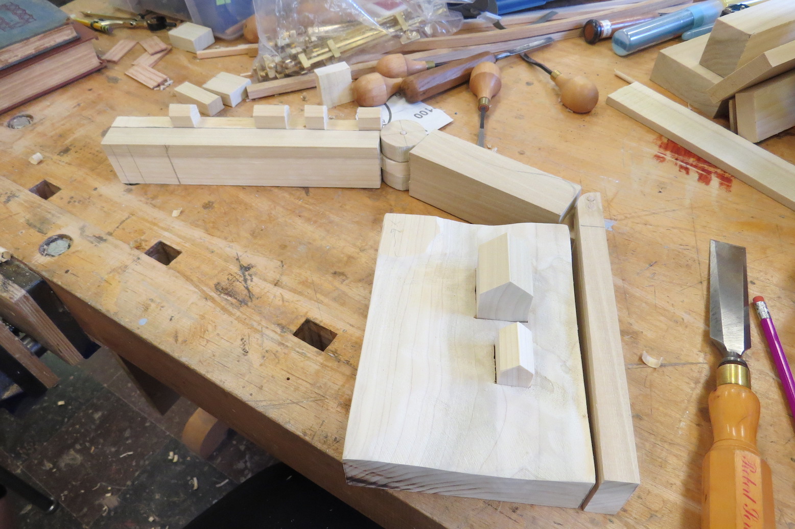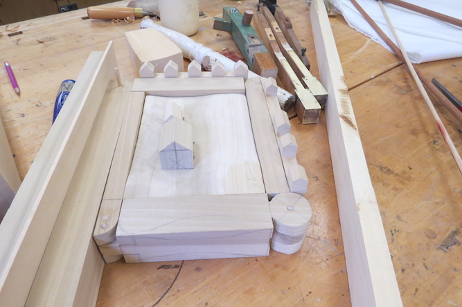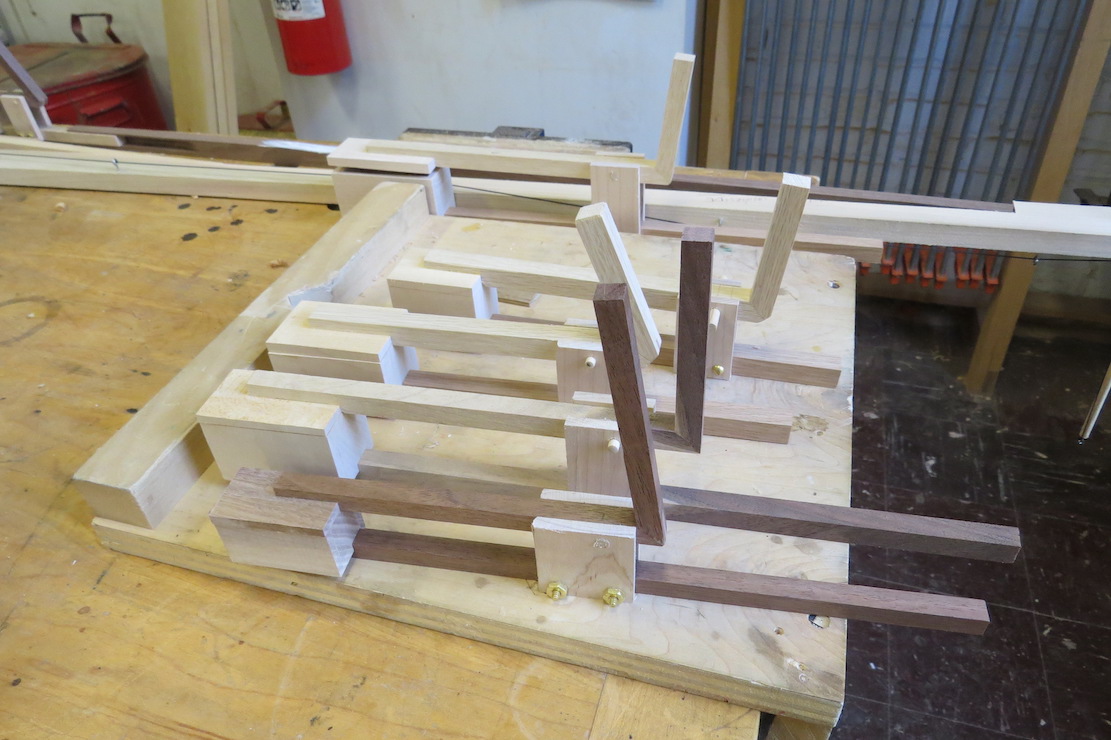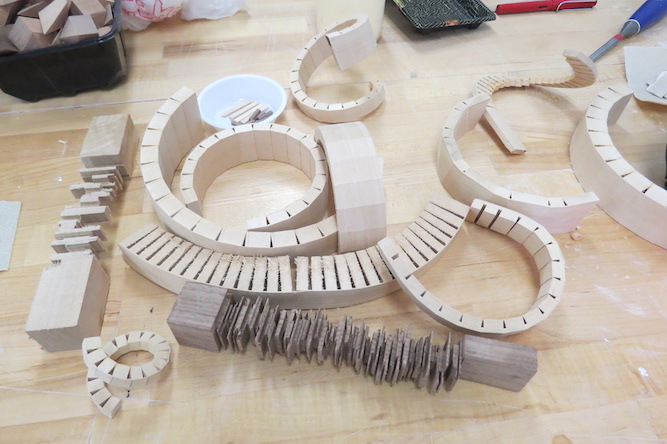 Another “crown” for Rebecca, the new one a prototype out of oak, which is helping her work up courage to use the ebony lumber, on the right in the photo. A wood-pearl-and-horsehair crown that Rebecca previously made can be seen in the background.
