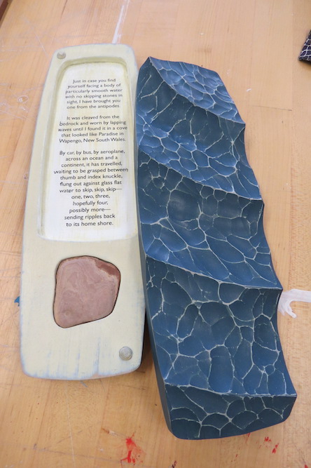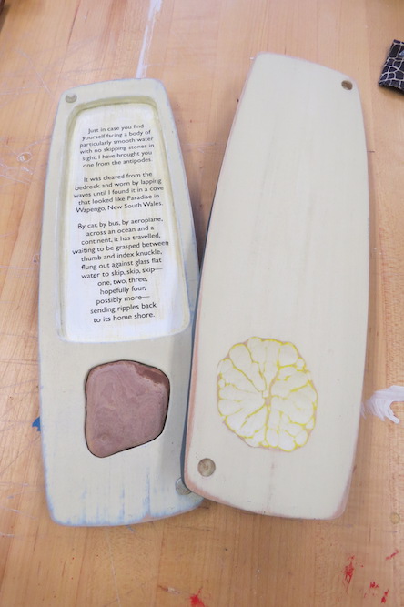 Ashley’s narrative skipping-stone-and-poetry box is almost finished. As I admire this box and then see her next project, it’s as though she brought a peaceful offering from Australia ….